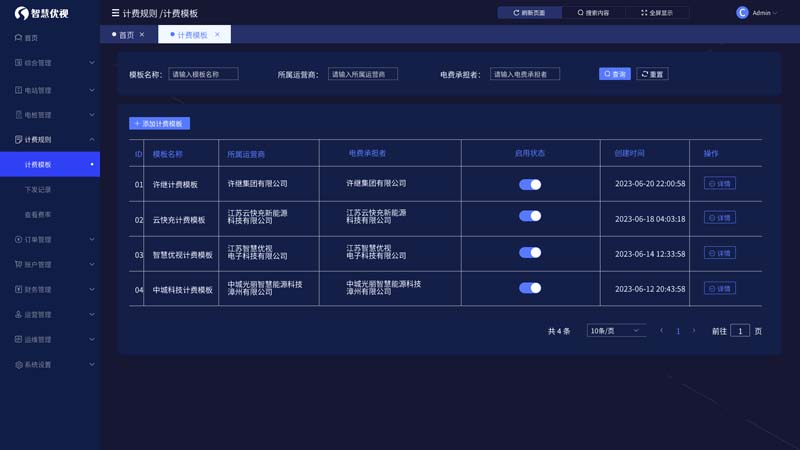 | 計費與支付管理 | 平臺可實時操作各充電樁或充電站計費規則,策略調整靈活且即時生效,兼具預覽、歷史記錄與智能推薦功能。 |
