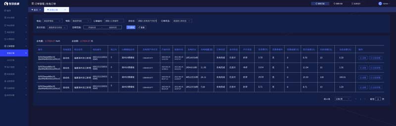 | 充電訂單 | 平臺記錄了用戶在充電站或充電樁的使用情況,包括開始時間、結束時間、充電時長、消耗電量、費用明細以及支付狀態。 |