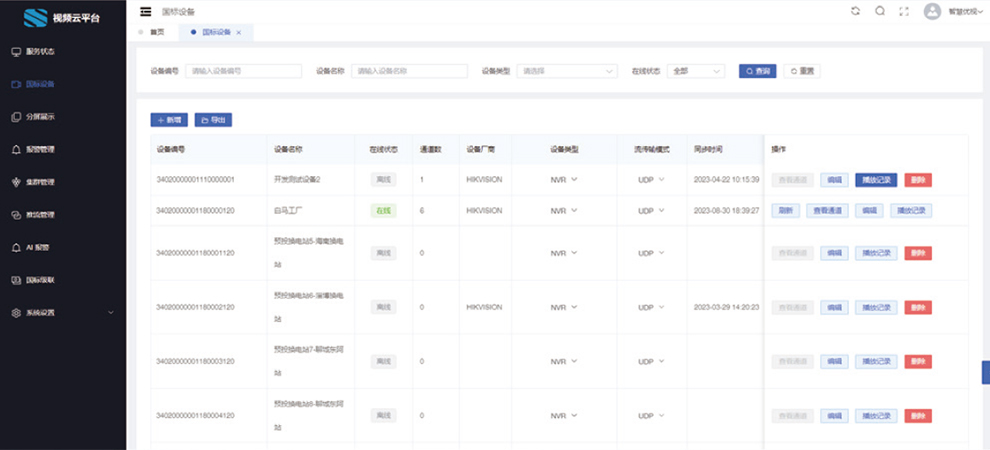 換電站專用的視頻云平臺區別于通用的視頻平臺,為換電站的監控提供了專有功能,平臺支持智慧優視、海康、大華等多個品牌廠商監控設備的接入。通過對監控設備的統一管理,實現了云端觀看監控視頻的直播和回放以及云臺控制等能力,此外還集成了AI算法能力,針對不同場景可提供相應的智能識別告警服務。